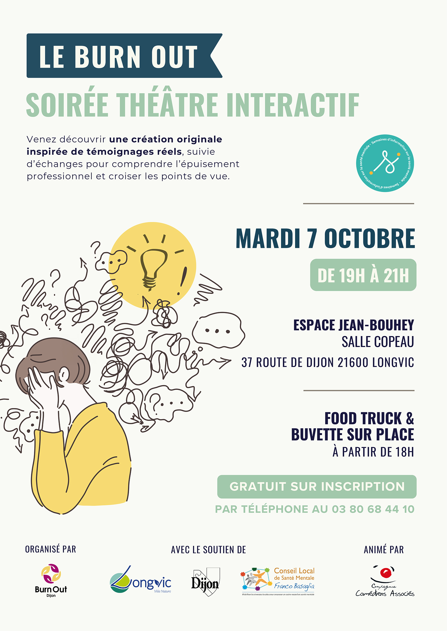 L’association Burn Out Dijon vous invite à une soirée de théâtre interactif autour du burn-out le mardi 7 octobre 2025, de 19h à 21h, à l’Espace Jean Bouhey à Longvic.